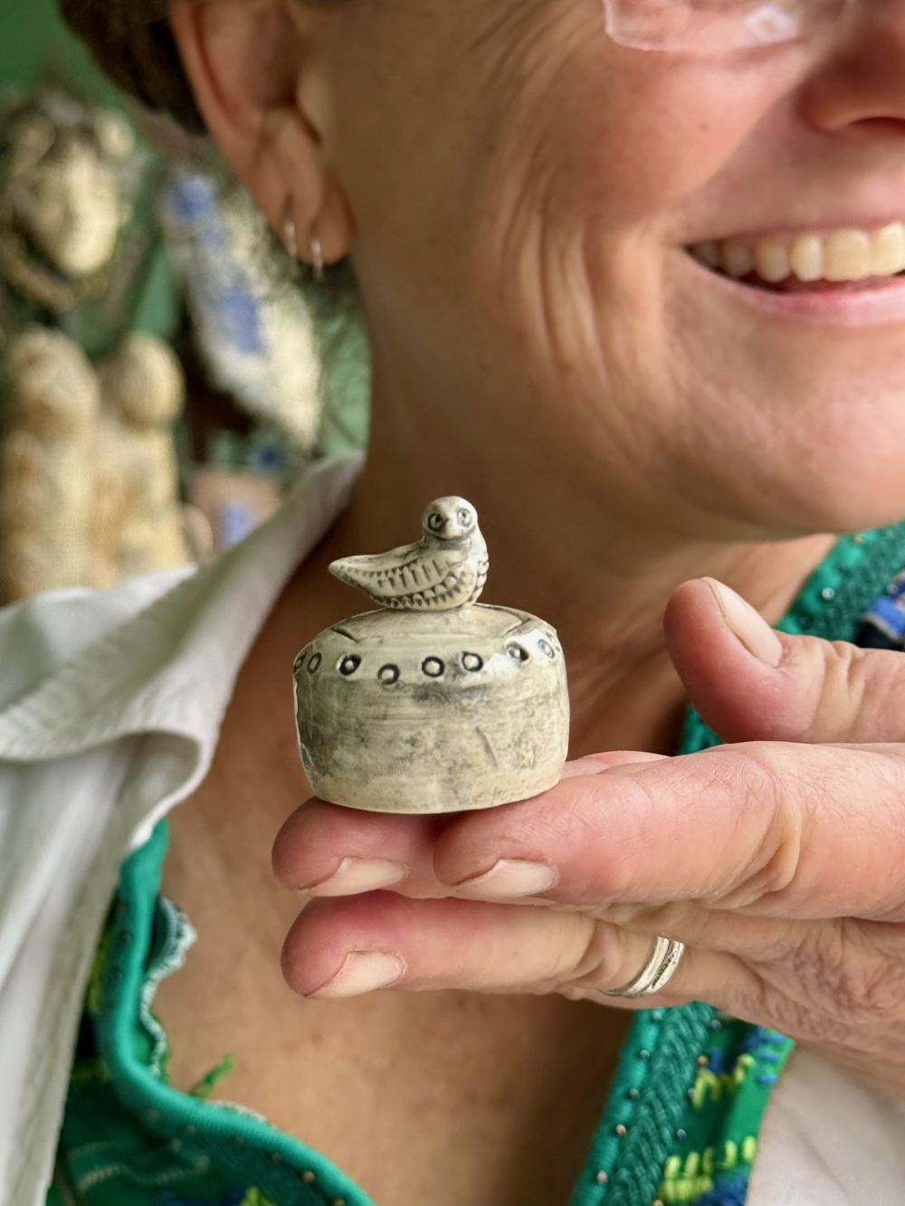Sara with one of her “miniature” meditations on nature through art.